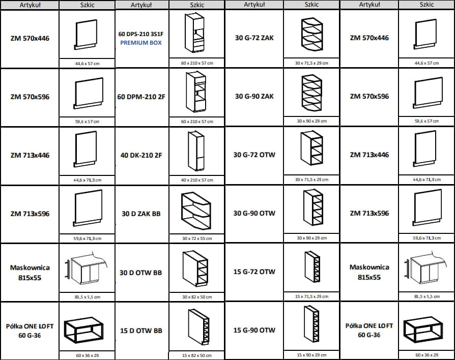 Wszystkie dostępne szafki kuchni Arona/Monza/Siena:
