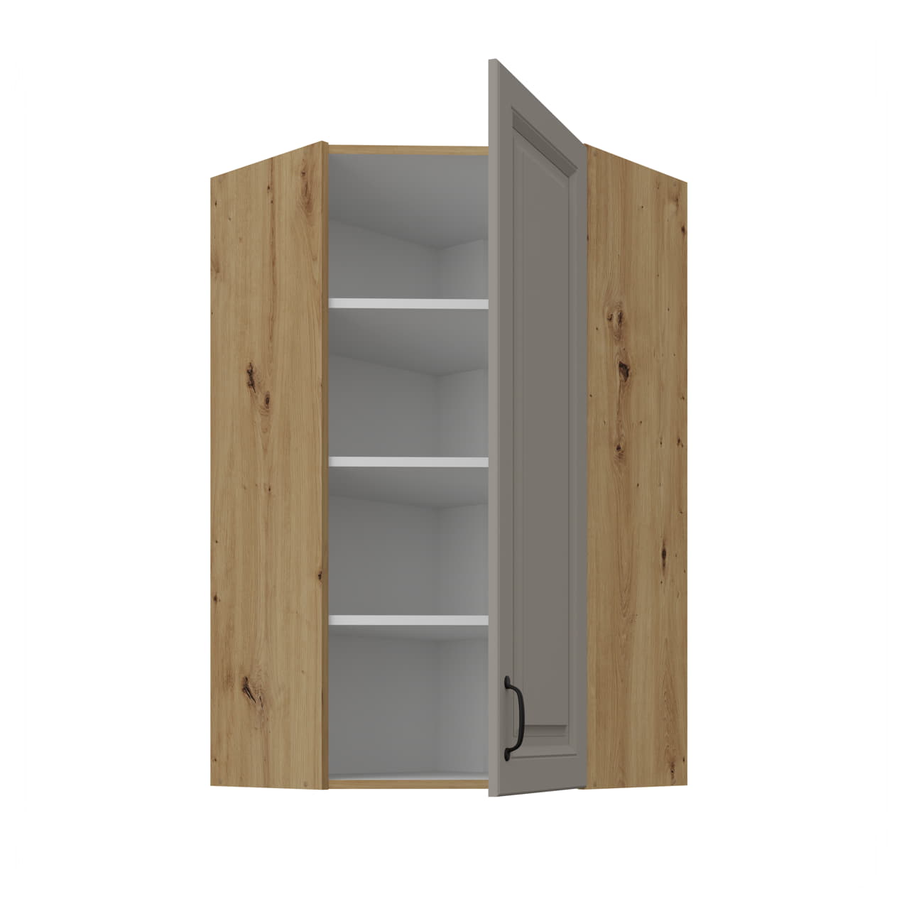 Stilo Clay grey / dąb artisan 60x60 GN-108 (45°) 1F - szafka górna wisząca narożna. Wyposażona w jeden front i trzy półki.