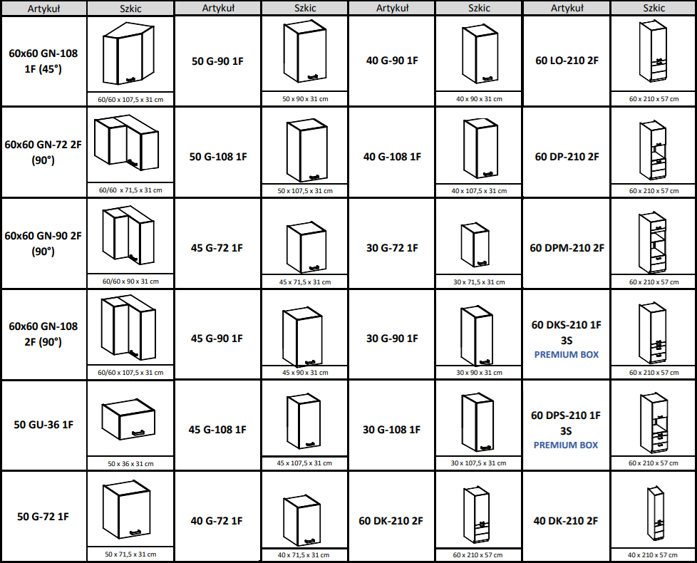Wszystkie dostępne szafki kuchni Artisan Cappucino połysk wraz z wymiarami: