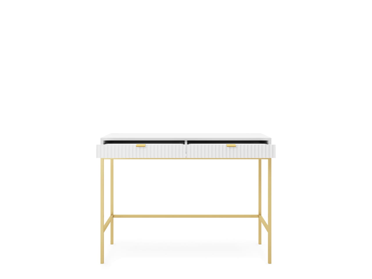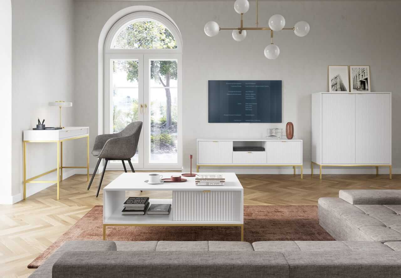 Kolekcja mebli Nova to nowoczesne połączenie funkcjonalności i minimalistycznego designu, idealne do stylowych wnętrz. Charakteryzuje się jasną kolorystyką z dominującą bielą, subtelnymi złotymi uchwytami oraz eleganckimi pionowymi żłobieniami na frontach. Smukłe, metalowe nóżki nadają meblom lekkości, a ich wysoka jakość wykonania zapewnia trwałość i wygodę użytkowania. Kolekcja obejmuje różnorodne elementy, takie jak komody, stoliki kawowe oraz szafki RTV, co pozwala na spójne urządzenie przestrzeni. Idealna dla osób ceniących prostotę, nowoczesność i harmonijne wnętrza.