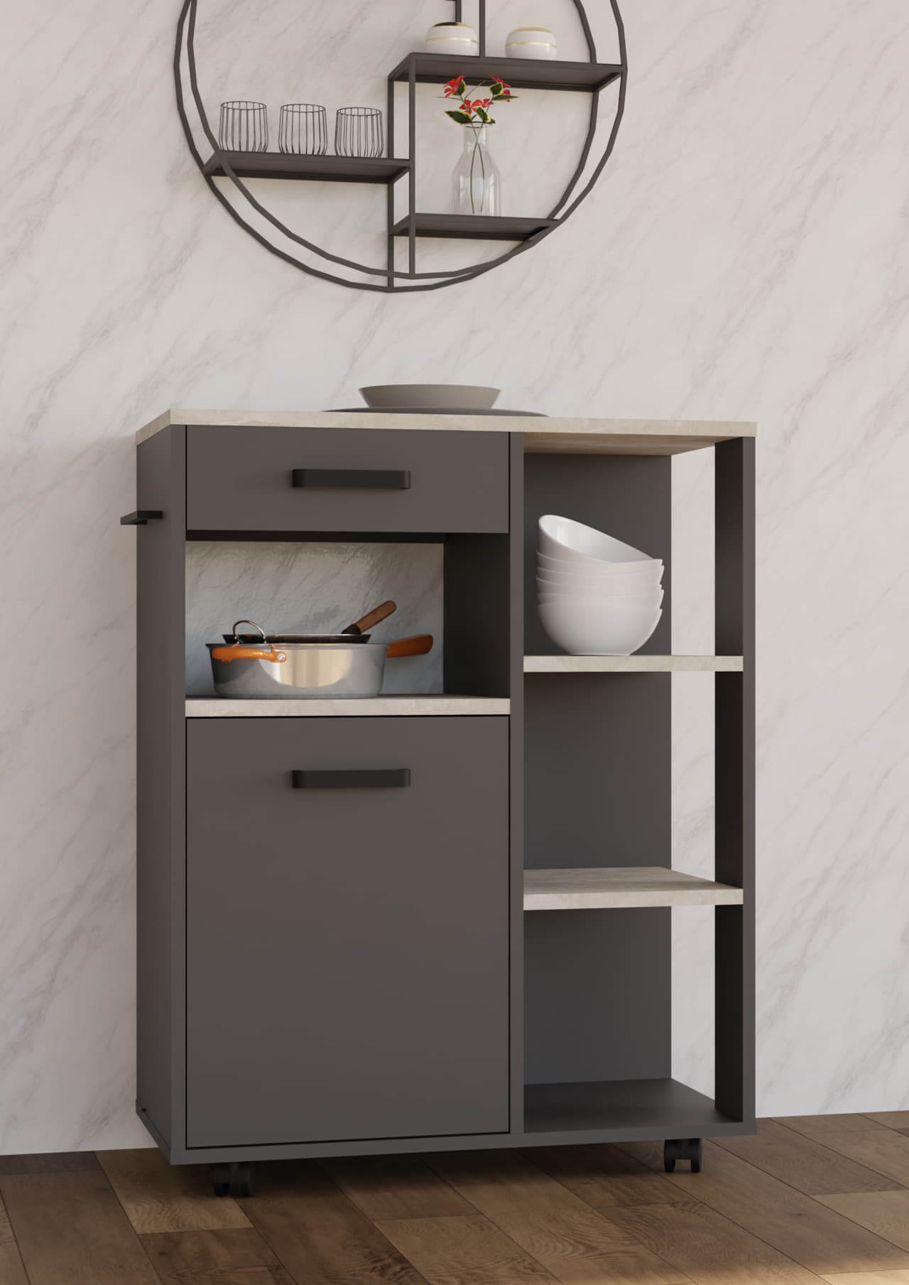 Wózek Roller 70 cm – kompaktowy, ale niezwykle funkcjonalny, idealny do przechowywania akcesoriów kuchennych. Wyposażony w kółka, które umożliwiają łatwe przesuwanie, zapewnia mobilność i wygodę w codziennym użytkowaniu. Dzięki swojej szerokości doskonale sprawdzi się w małych kuchniach, gdzie liczy się każdy centymetr.