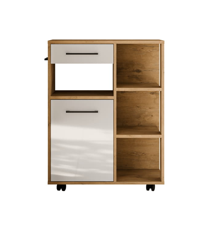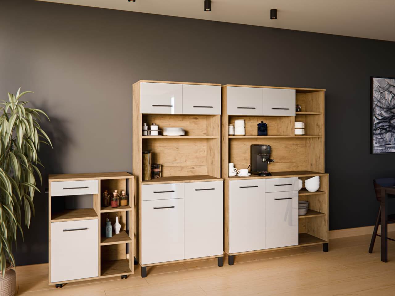 Bufet kuchenny Vigo w zestawieniu białego połysku i dębu lancelot to doskonała propozycja dla osób, które cenią nowoczesny styl, praktyczne rozwiązania i elegancję w codziennym użytkowaniu. To mebel, który nie tylko ułatwia organizację przestrzeni, ale również staje się ozdobą każdej kuchni.