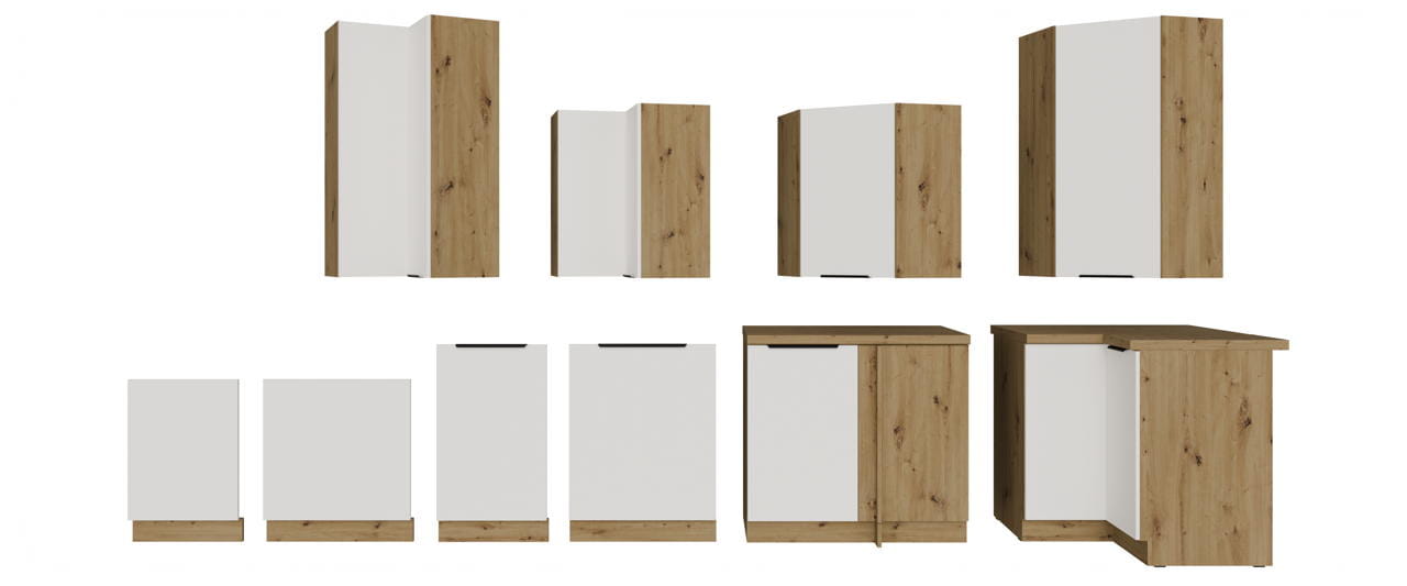 - połączenie korpusu koloru dąb artisan wraz z frontami w kolorze białym,