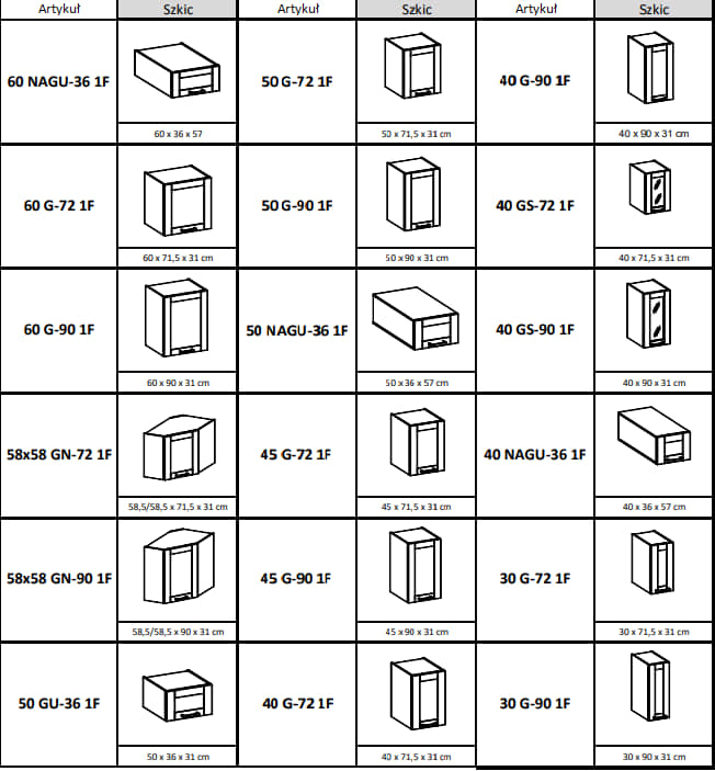 Wszystkie dostępne szafki kuchni Stilo: