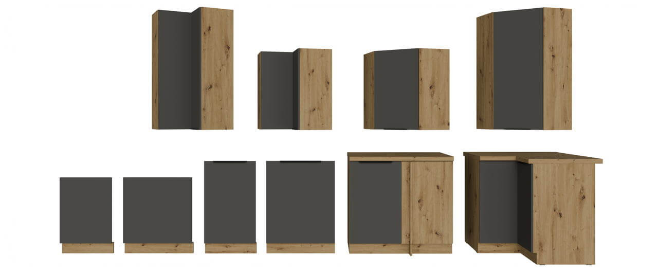 - połączenie korpusu w odcieniu dąb artisan z frontami w kolorze grafitowym,