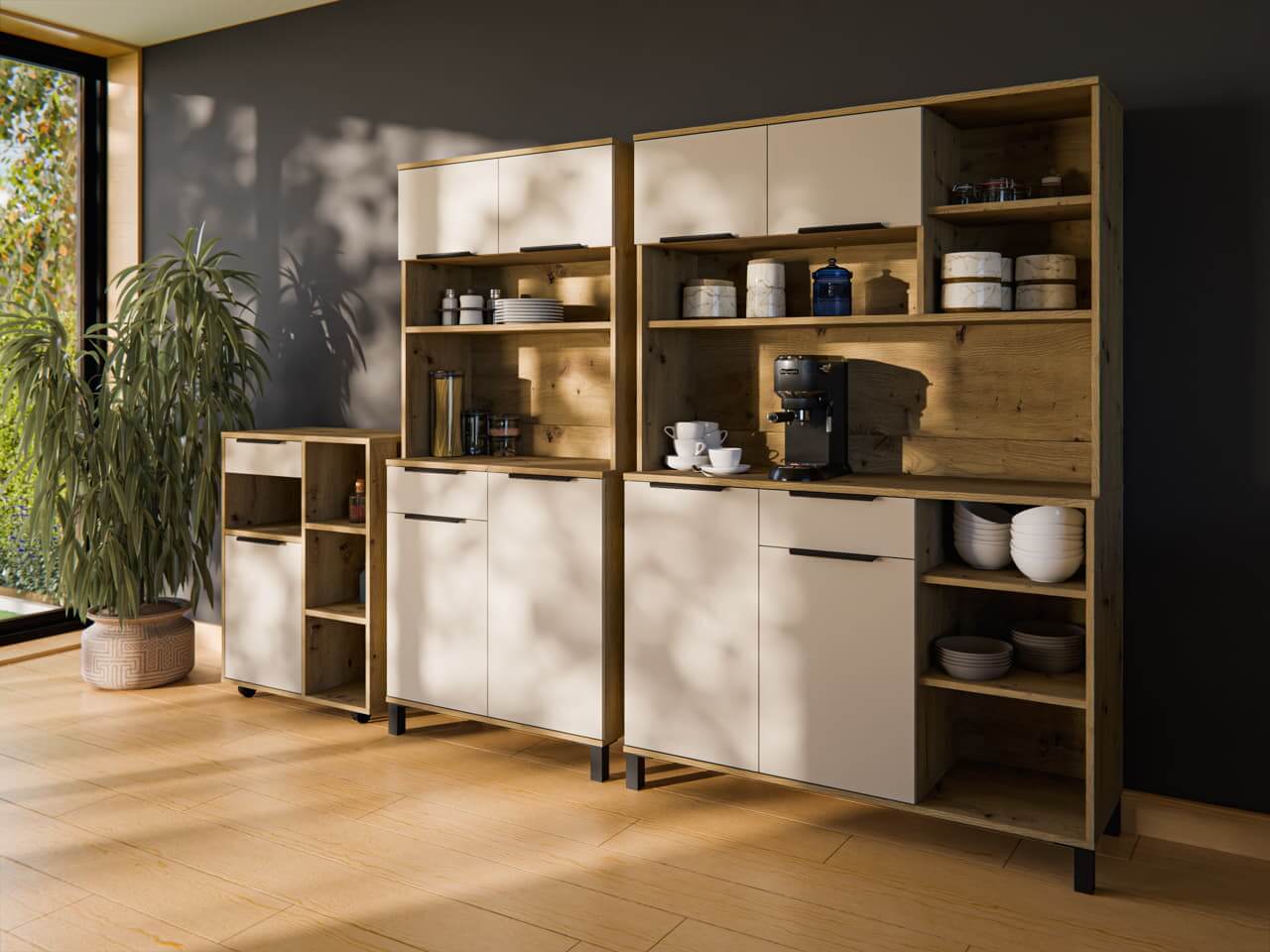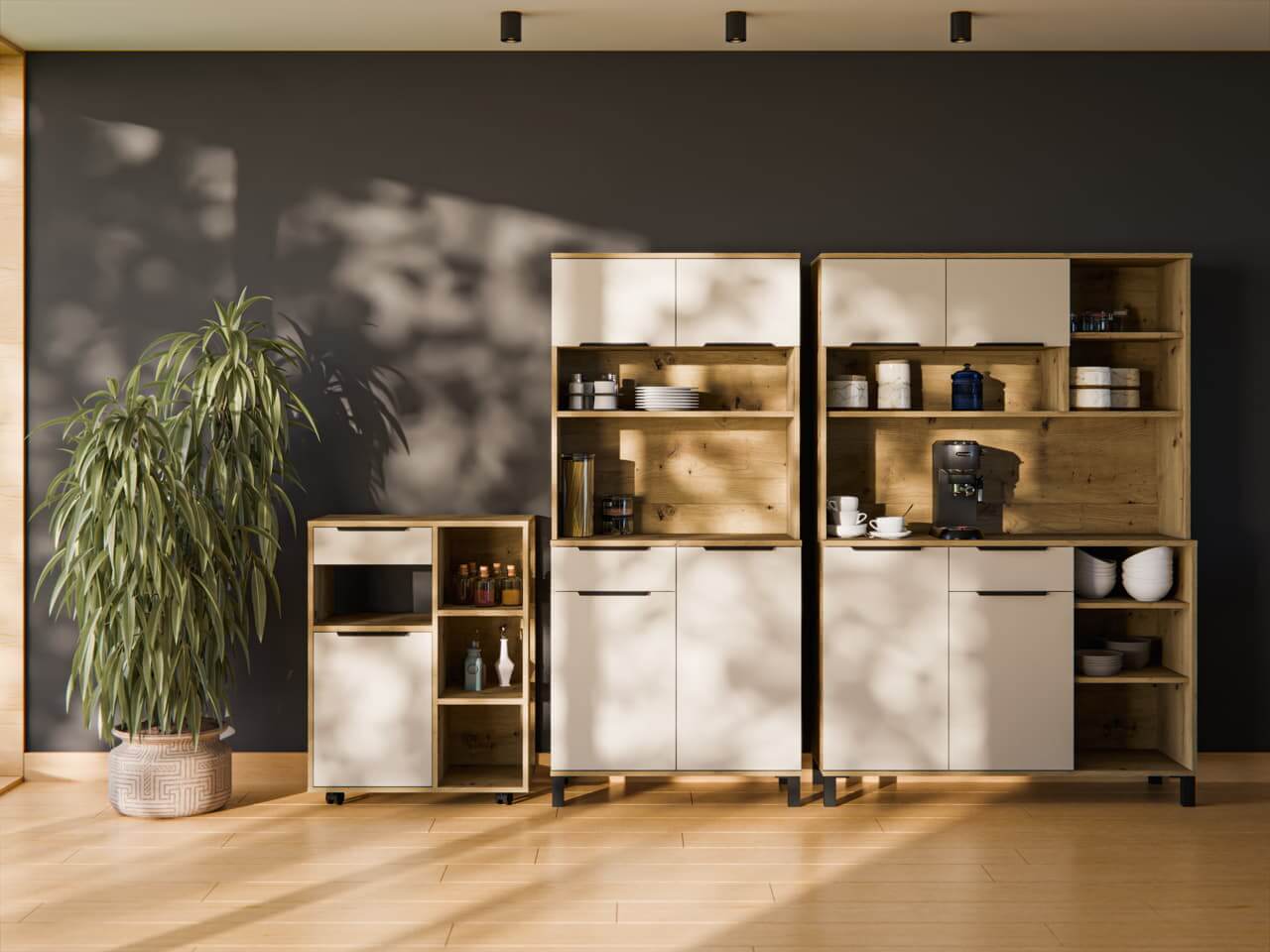 Bufet kuchenny Solea w kolorze kaszmir z korpusem dąb artisan to idealny wybór dla osób, które pragną połączyć elegancję i funkcjonalność z ciepłem naturalnych barw. Doskonale wpisze się w nowoczesne, skandynawskie lub klasyczne wnętrza, tworząc wyjątkowo przyjemną przestrzeń do gotowania i spotkań.