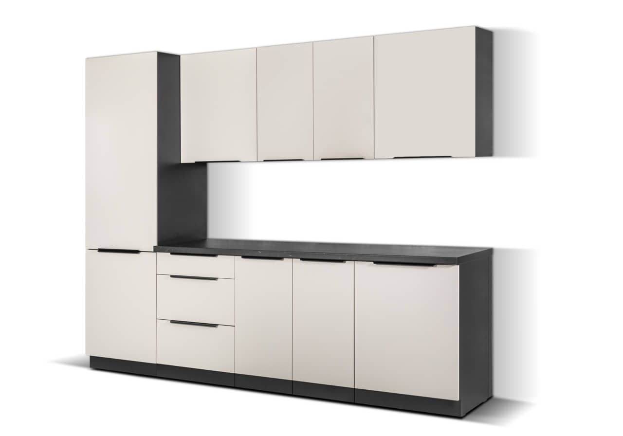 Zestaw mebli kuchennych o długości 260cm w skład którego wchodzi 7 szafek kuchennych z dedykiwanym blatem Marmur Roma.