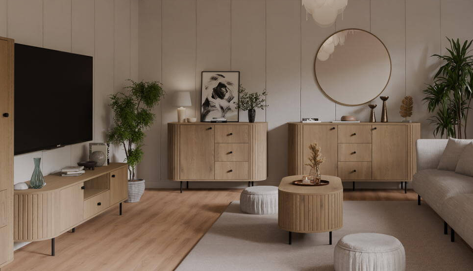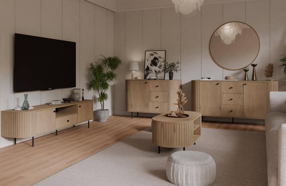 W skład kolekcji Ovalio wchodzą: komody, stoliki RTV, stolik kawowy, lustra, witryny oraz toaletka, co pozwala na kompleksowe i spójne urządzenie salonu, jadalni lub sypialni.