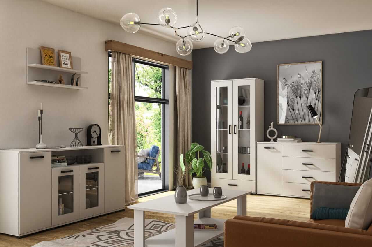 ✔ Praktyczne rozwiązania – pojemne szafki, witryny z przeszkleniami oraz funkcjonalne stoliki kawowe sprawdzą się w codziennym użytkowaniu.