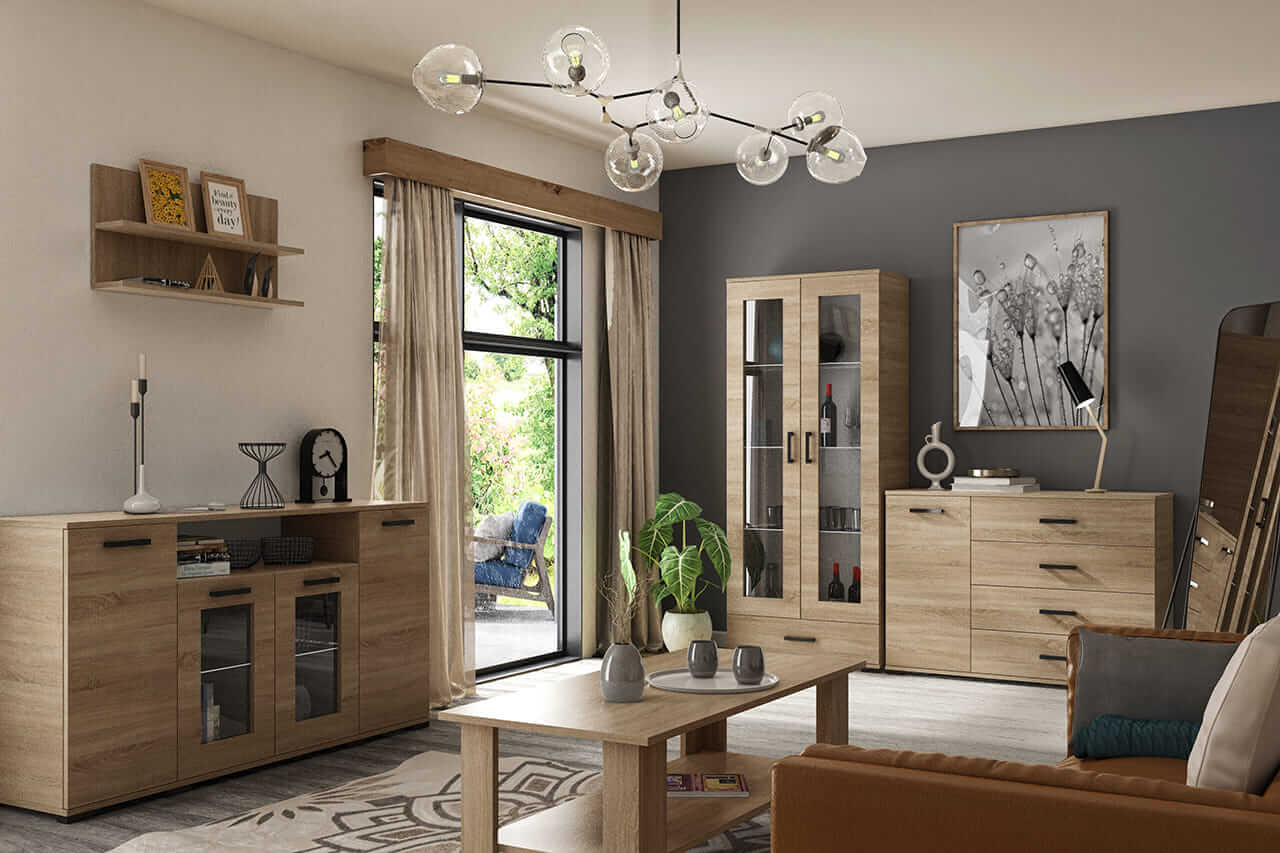 ✔ Praktyczne rozwiązania – pojemne szafki, witryny z przeszkleniami oraz funkcjonalne stoliki kawowe sprawdzą się w codziennym użytkowaniu.