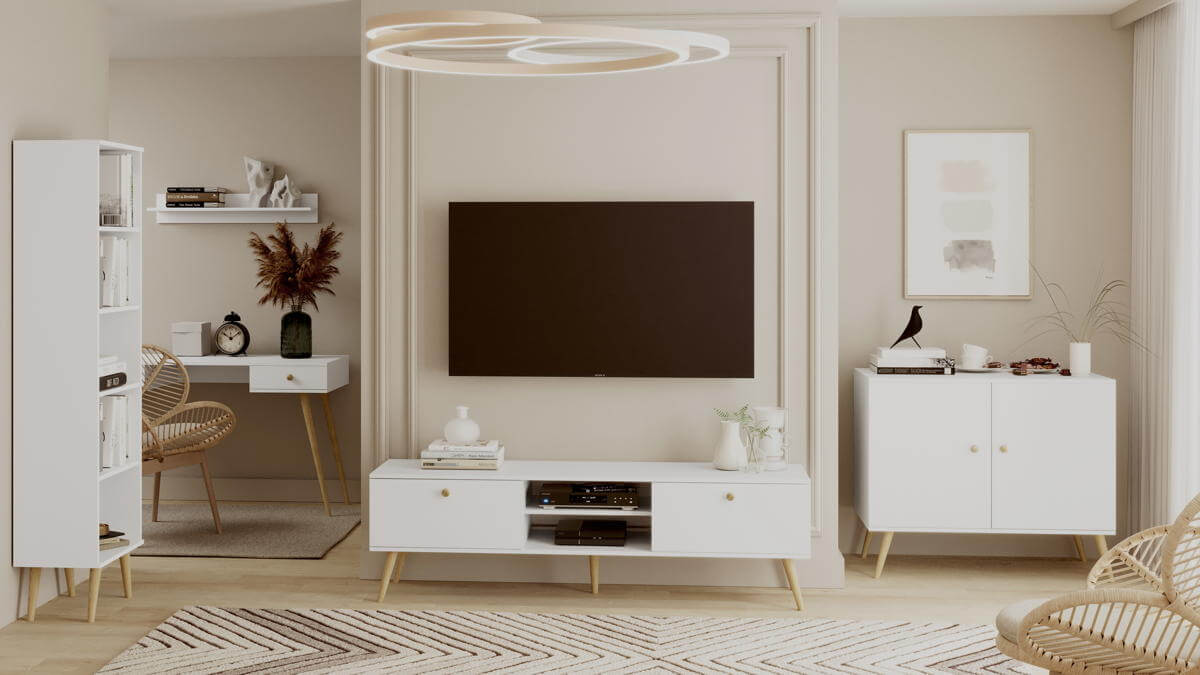 ✔ Funkcjonalność – komoda, regał i szafka RTV zapewniają praktyczne przechowywanie i porządek.