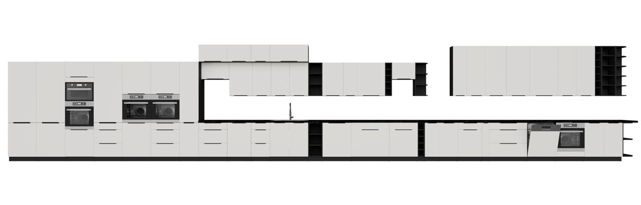 Zestaw mebli kuchennych o długości 390 cm w skład którego wchodzi 15 szafek kuchennych bez blatu.