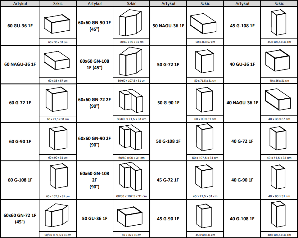 - szafki sprzedawane w paczkach wraz z czytelną instrukcją montażu oraz wszystkimi potrzebnymi okuciami,