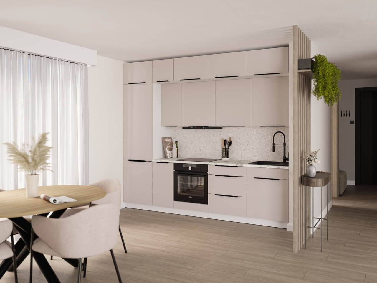 Kolekcja kuchni Como to harmonijne połączenie subtelnej elegancji i nowoczesnej funkcjonalności. Białe korpusy wprowadzają do wnętrza lekkość i świeżość, stanowiąc doskonałe tło dla stylowych, kaszmirowych frontów. Ten delikatny, ciepły odcień nadaje kuchni przytulnego charakteru, jednocześnie zachowując jej minimalistyczny i ponadczasowy wygląd.
