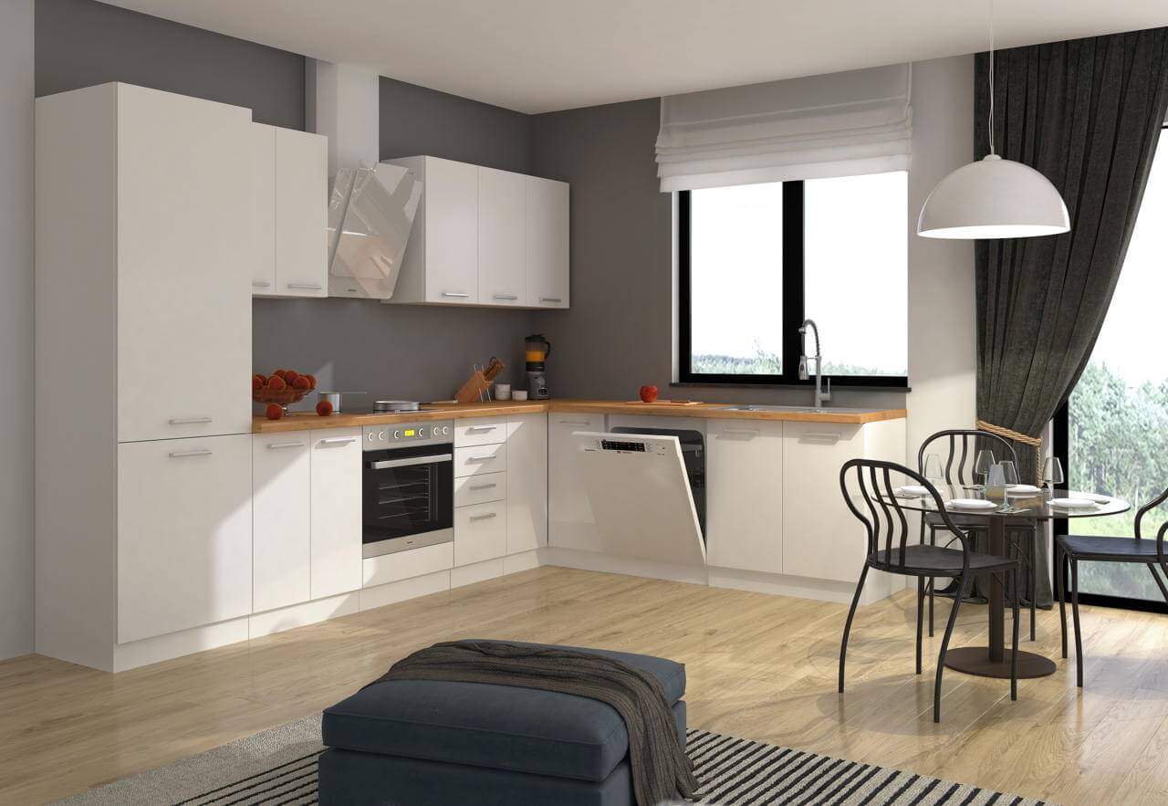 Zestaw szafek kuchennych Eko White 310x230 w skład którego wchodzi 10 szafek z blatem kuchennym.