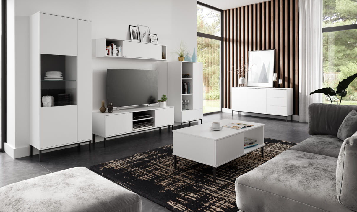 Kolekcja Querty to propozycja dla osób chcących zaaranżować swój salon w stylu LOFT. Elementy systemu zostały wyposażone w czarny metalowy stelaż. Drzwi oraz szuflady posiadają system bezuchwytowego otwierania - system push to open. Kolekcja dostępna jest w trzech wybarwieniach: czarny, biały oraz hikora. Szeroki wybór kolorystyki oraz mnogość brył pozwoli zaaranżować salon wedle Twoich potrzeb.