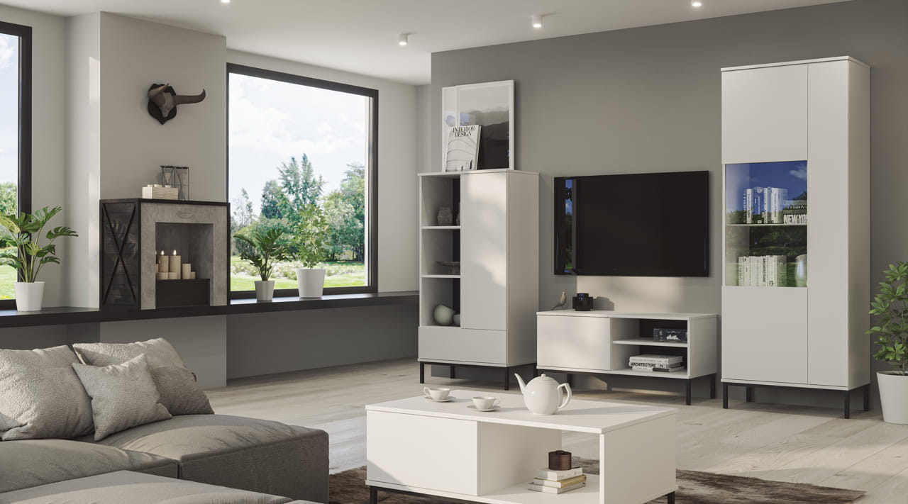 Kolekcja Querty to propozycja dla osób chcących zaaranżować swój salon w stylu LOFT. Elementy systemu zostały wyposażone w czarny metalowy stelaż. Drzwi oraz szuflady posiadają system bezuchwytowego otwierania - system push to open. Kolekcja dostępna jest w trzech wybarwieniach: czarny, biały oraz hikora. Szeroki wybór kolorystyki oraz mnogość brył pozwoli zaaranżować salon wedle Twoich potrzeb.